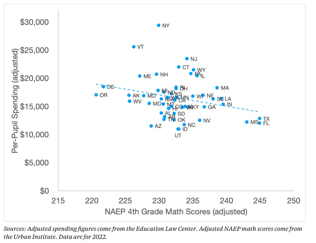 You can also see this in the data. Writing in The 74 last month, I noted that Blue states are the higher-spending ones, but they’re not getting better outcomes. New York, Vermont, New Jersey and Connecticut are getting pretty mediocre results given their investments.