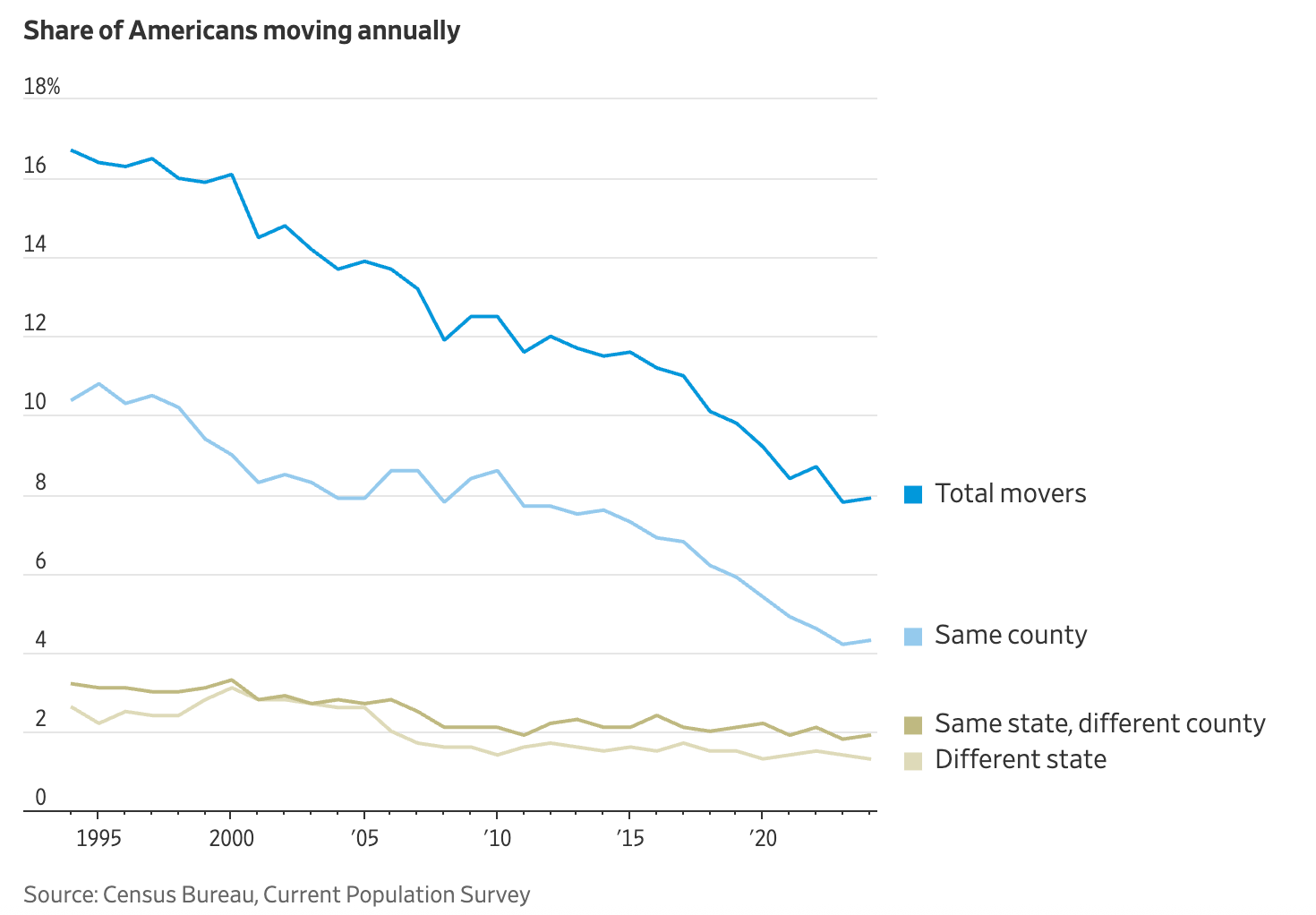 The current economic environment and high housing costs, particularly in larger urban areas in the Northeast and California, could be contributing to the latest trends. But the issue runs deeper, and longer, than just the most current years. Here’s the key graph from the WSJ piece. As you can see, the share of Americans who move in a given year has roughly fallen in half from 1995 to 2025.