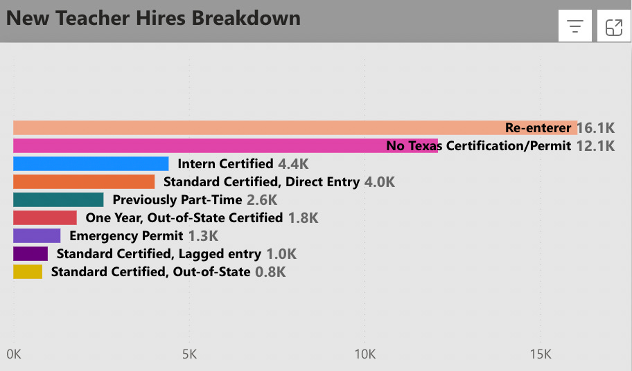 The next chart comes from the same state dashboard. As you can see, the largest source of new hires are actually re-enterers. These are people who taught for a while, took some time off, and then came back into the profession. Having a large number of re-entrants is not unique to Texas and is often a large source of teachers for schools all across the country.