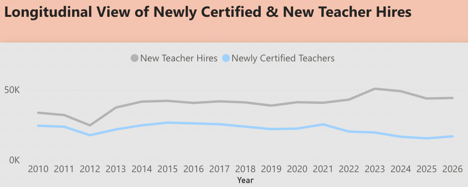 And take a moment to think about the number of newly licensed teachers versus the number of new teacher hires. Which one would you expect to be higher?