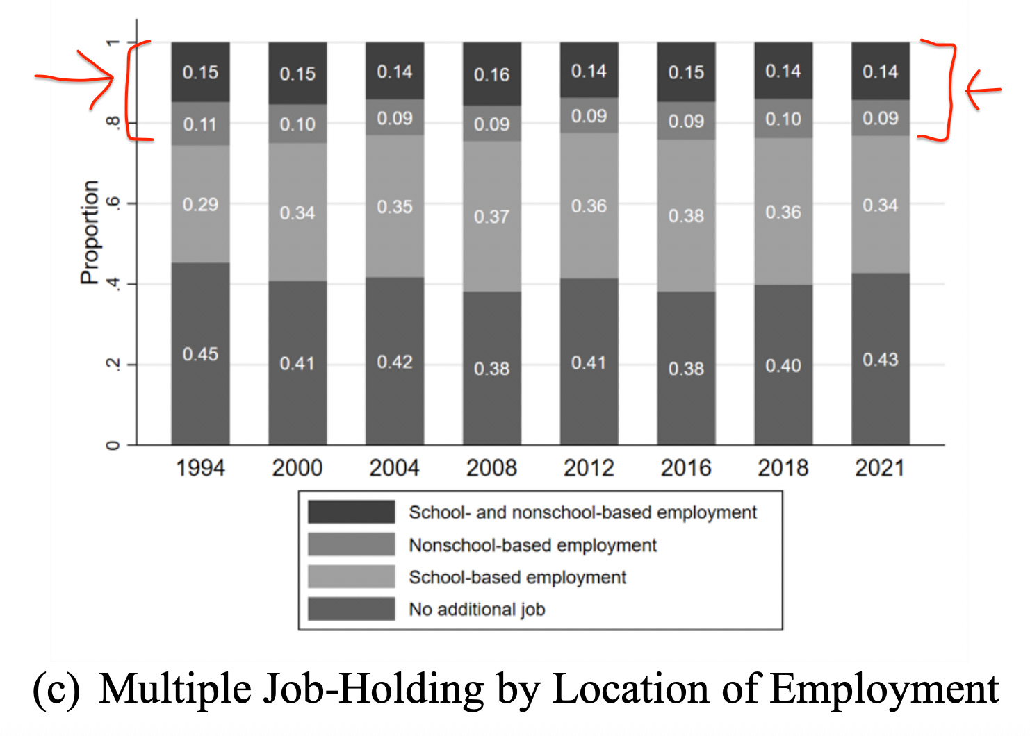These are pretty small changes, but these summary stats suggest there’s been any type of surge in teachers holding second jobs. Meanwhile, 45 percent of teachers had no additional job in 1994. In 2021, that figure had fallen to 43%. It all looks pretty constant over time.