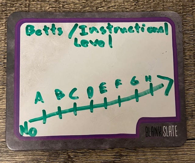 More importantly, this idea has carried over into the modern moment. Shanahan estimates that the majority of American children are being taught using these sorts of “instructional-level” texts, as opposed to truly “grade-level” ones. Most (in)famously, the Fountas and Pinnell Benchmark Assessment System sorts kids and books into an A-Z continuum. The result is a very slow progression that may or may not end in grade-level reading success.