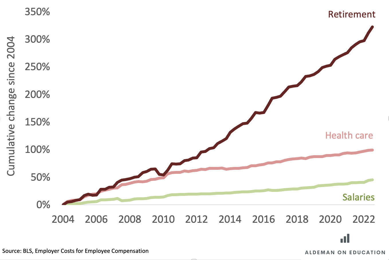 In Part 1 I look at the escalating costs of teacher pension plans nationally. I show that rising pension costs are a key reason behind stagnant teacher pay. Worse, the increase in pension costs is all coming from growing “pension debts,” aka the money that should have been put into the plans in the past but isn’t there to fund the pension payments that politicians have promised.