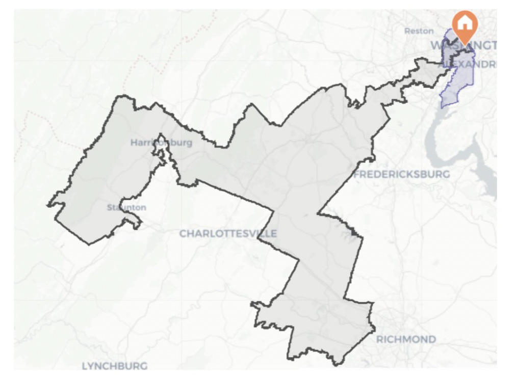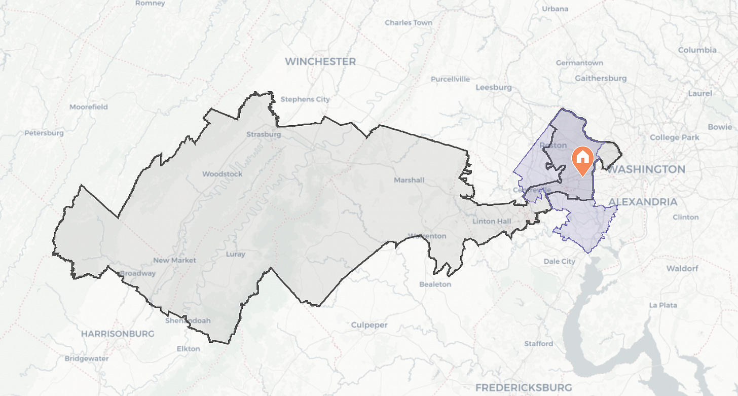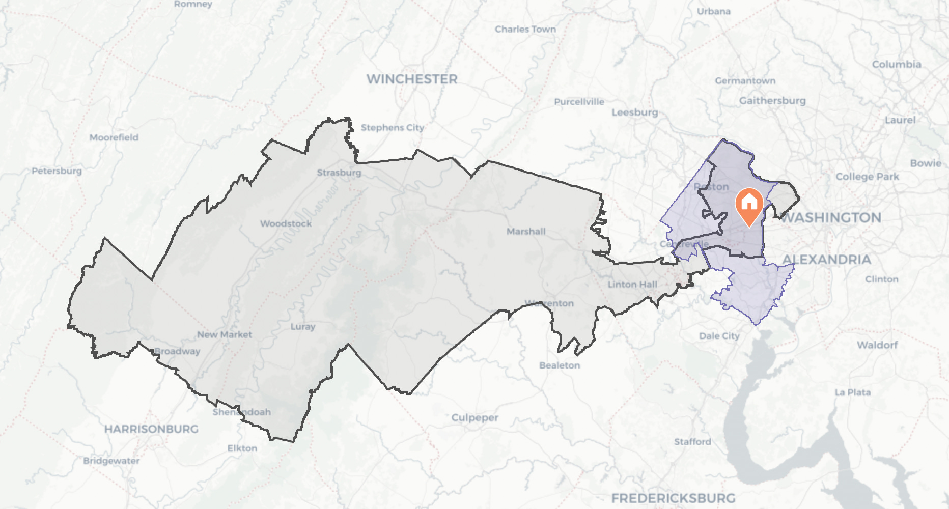 They get there by squeezing every Democratic vote in northern Virginia and creating some pretty crazy-looking maps. Here’s what it would look like for my district. You can see my current district, shaded in purple at the far right. The new map would carve out an entirely different footprint (in black).