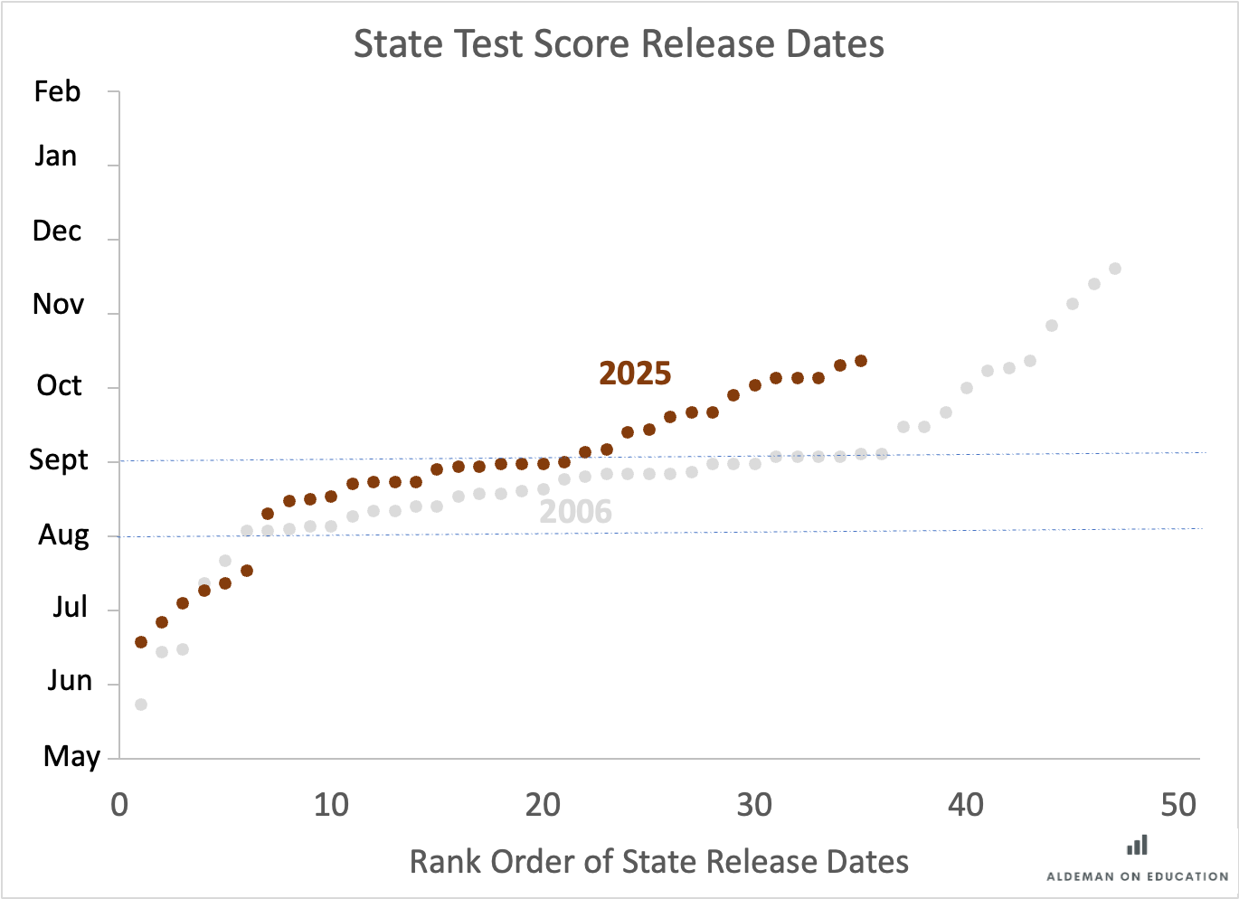 How long? In 2025, six states released their results by the end of July. That is, the fastest states today are on par with the fastest states from 2006. But the rest are worse. This year, only 20 states and the District of Columbia released their results before September 1st. Worse, 16 states had still not released their results when I looked in mid-October.