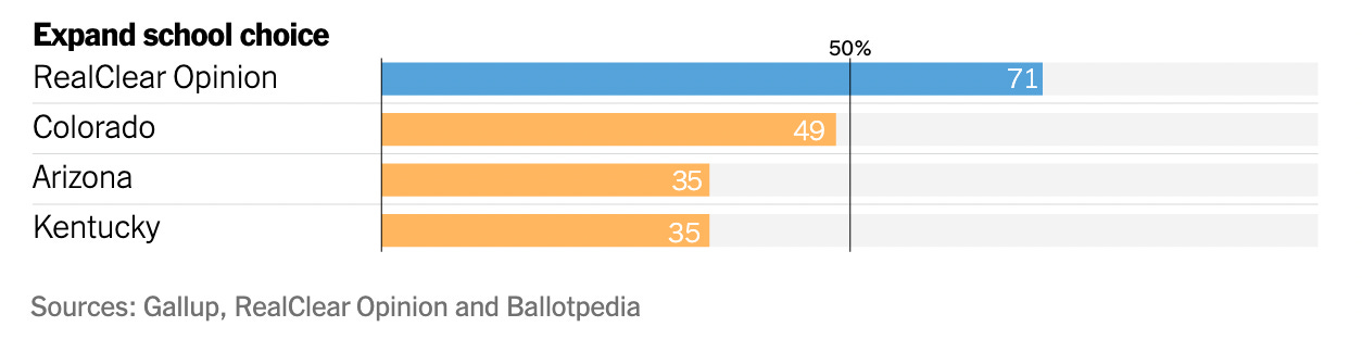 And what about in education? Lopez points to the contrast between the issue polling around school choice versus what happens when it actually goes on the ballot. Based on his preferred survey numbers, 71% support expanding school choice. Meanwhile, school choice referenda actually failed on recent ballot initiatives in Colorado, Arizona, and Kentucky.