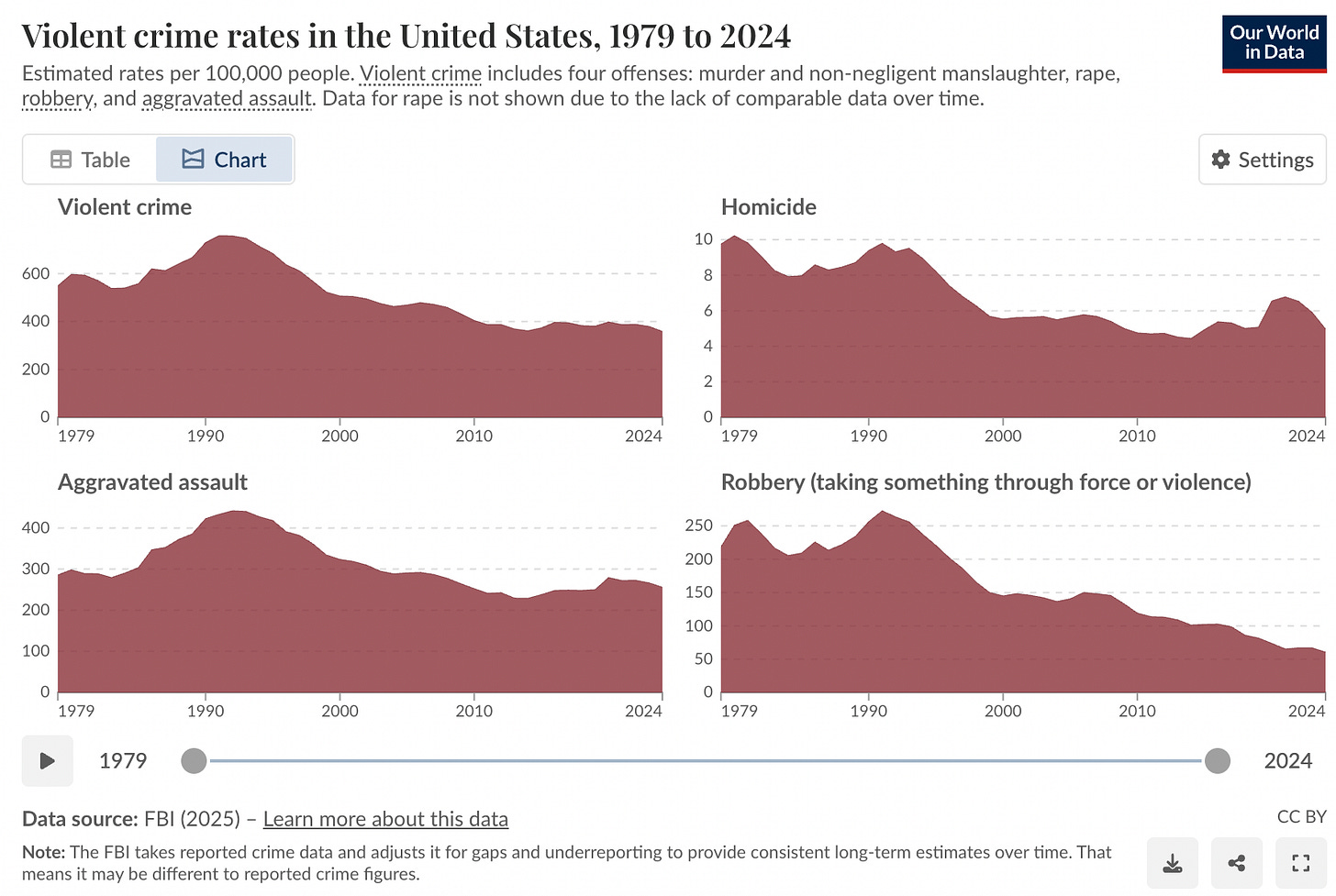 First of all, violent crime rates are significantly lower than they were in the 1990s. Homicides, aggravated assaults, and robberies are all way down. There was a small but important spike in the murder rate in the wake of COVID, but thankfully things are trending back down again.