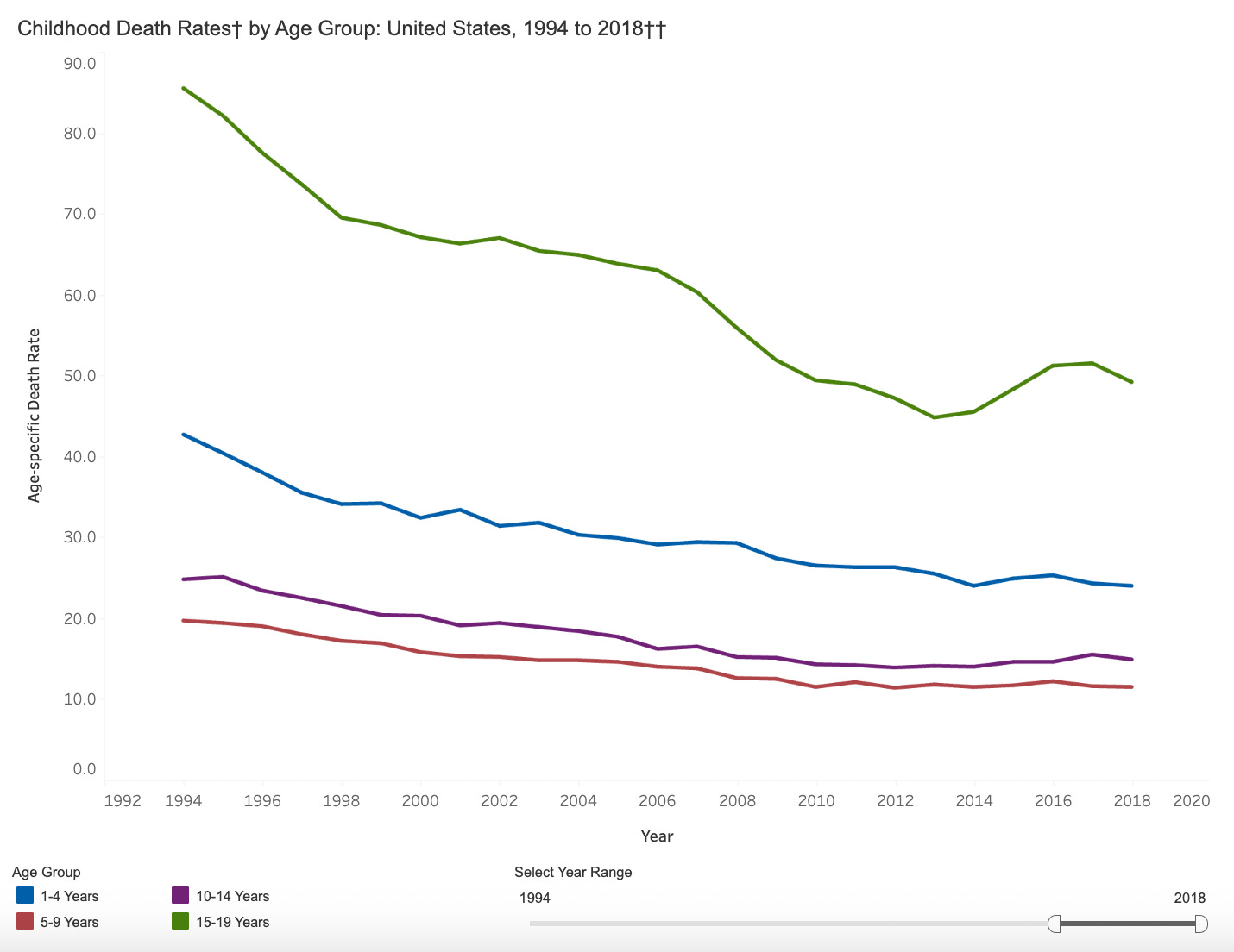 So, crime is down across a range of types, age groups, and locations. And so are death rates. We made HUGE gains in childhood mortality rates in the first half of the 1900s, but they have fallen by another 40-50% in the last few decades.