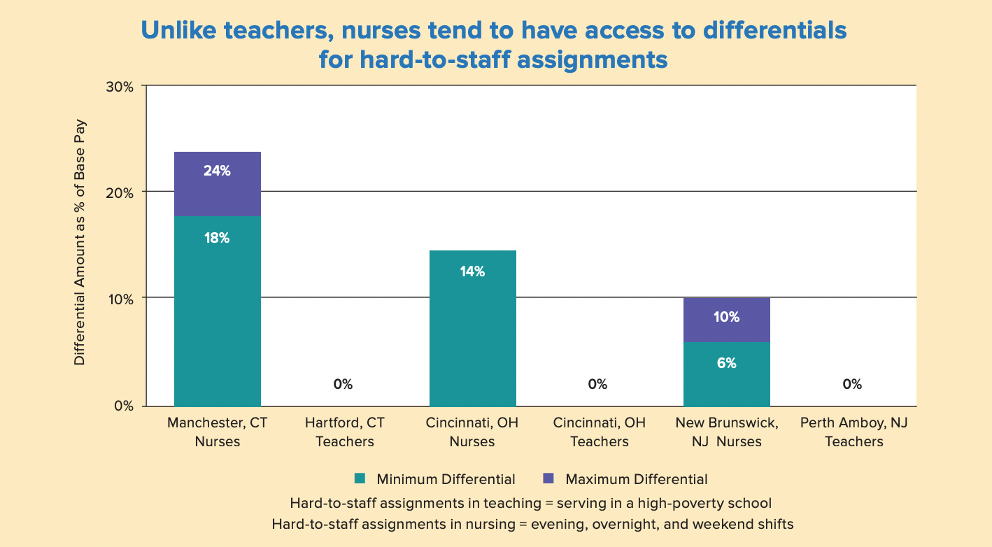 The National Parents Union published a report recently looking at the differences between teachers and nurses when it comes to differential pay. It turns out that the nursing profession is much more likely to use differential pay to combat shortages in particular geographic areas or specialty areas.