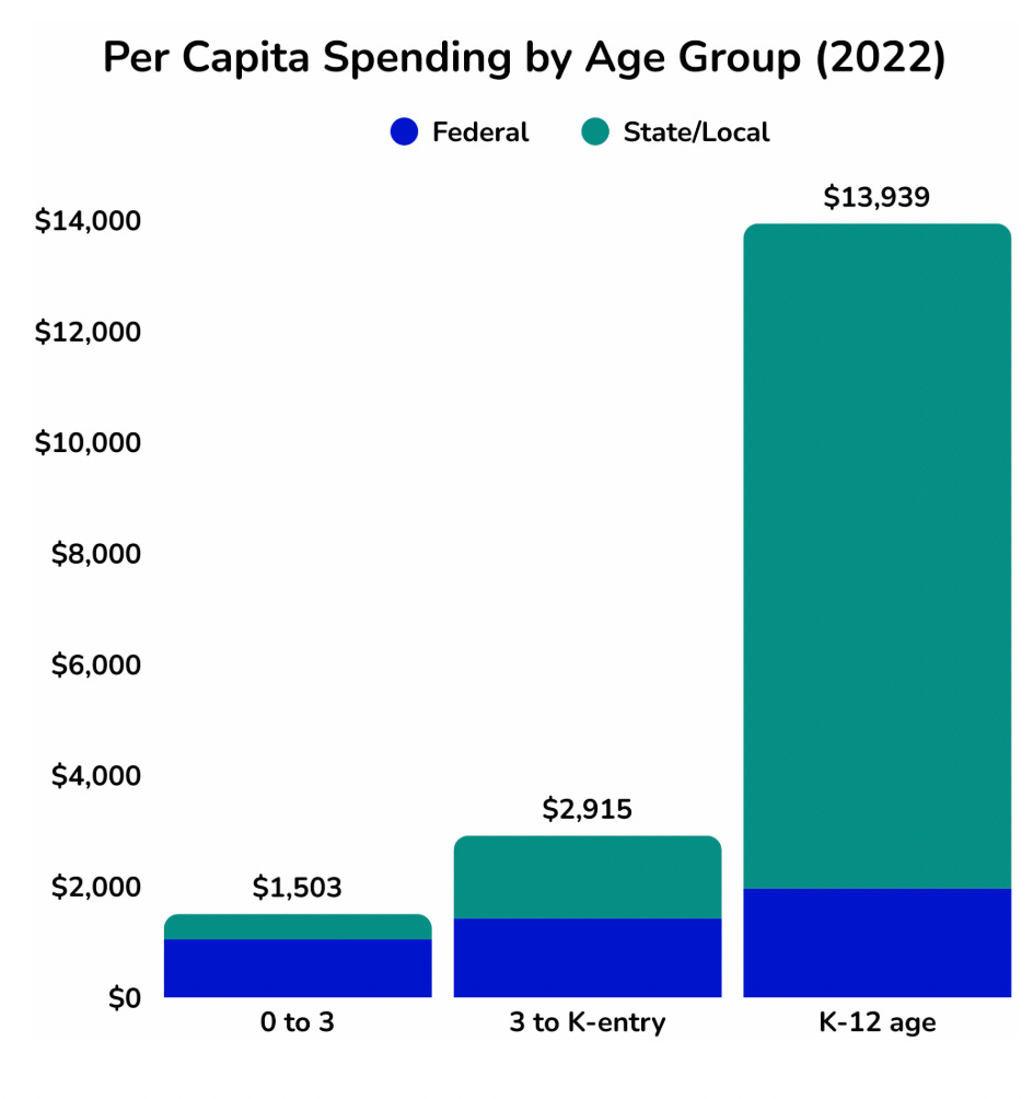 The chart below highlights a striking imbalance. In 2022, we invested just $1,503 per child ages 0–3 and $2,915 per preschooler—compared with $13,939 for each student in public K–12 education.