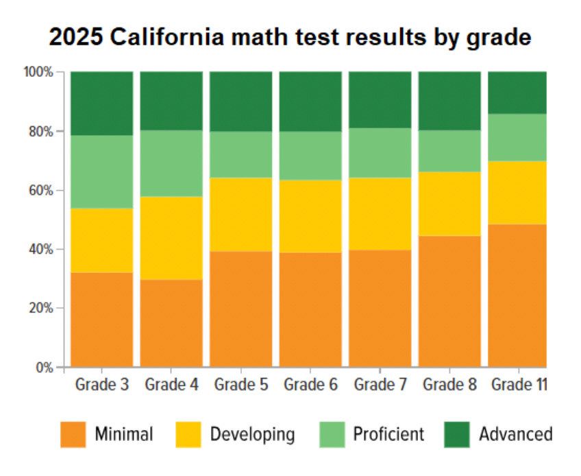 I have a new piece out for EdSource noting that math proficiency rates tend to decline across grades. As I write, “Among third graders, just 46% of California students met the state’s expectations (proficient or advanced) in math. That’s bad, but it gets worse. Among fourth graders, the percentage fell to 42%. Those percentages continued to decline until just 31% of 11th graders met the state’s expectation in math.”