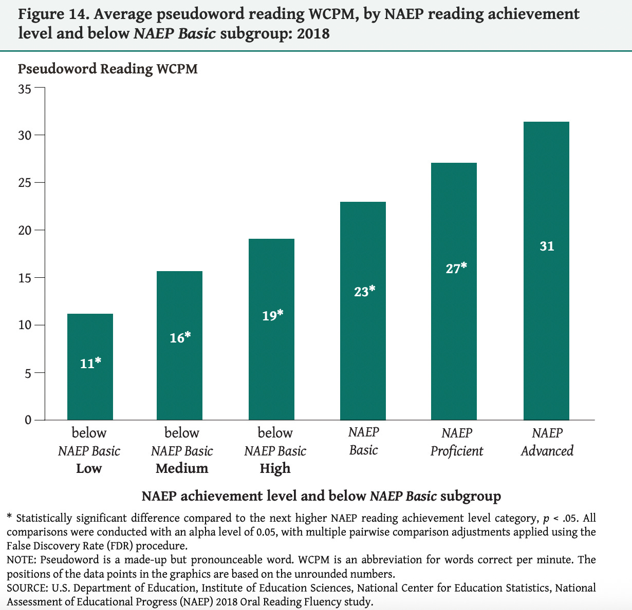 In the NAEP study, they tested this by looking at whether students could decode what are called “pseudowords” or “nonsense” words like “bep” or “glork.” These aren’t actual words but they should be decodable anyway if kids know how the English language works. As you can see in the graph below, the kids who score the lowest on NAEP reading comprehension questions are the worst at reading these nonsense words. Better readers are better decoders.